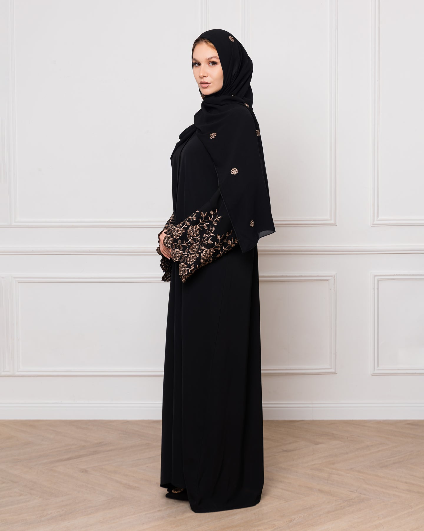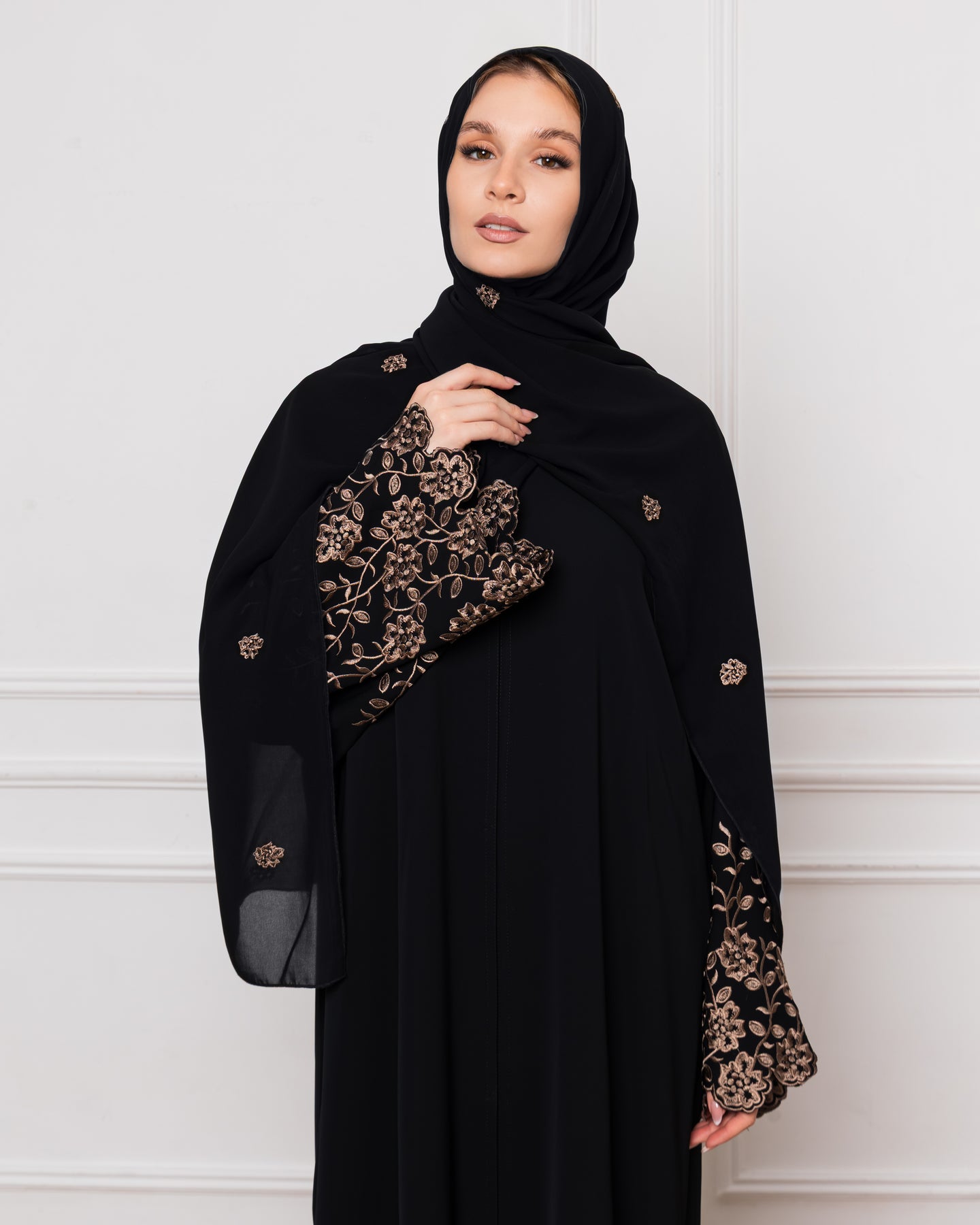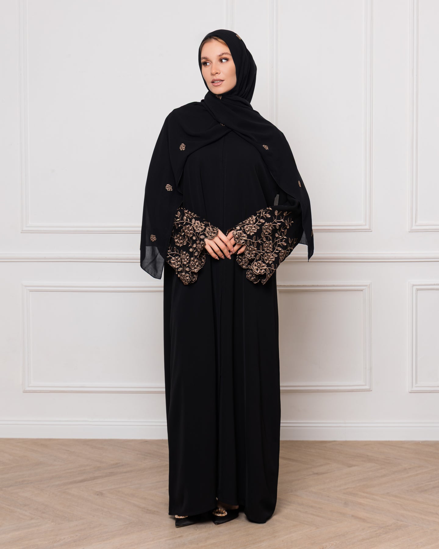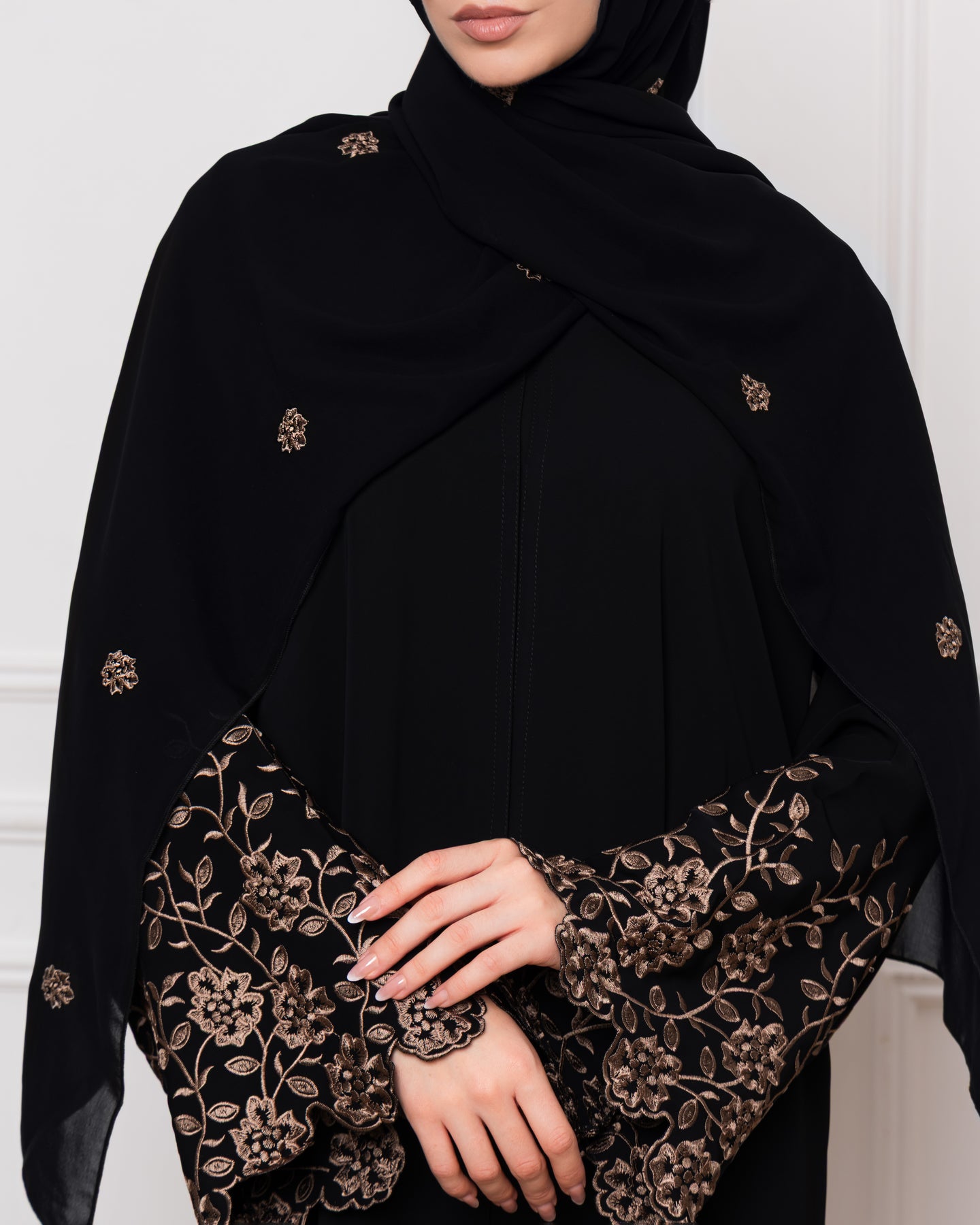 The abaya features a front-open design with fastening buttons, making it easy to layer and style. Paired with a pure Arabic chiffon scarf (80 x 28 inches) finished with matching floral embroidery, this set delivers a complete, polished look without any extra effort.