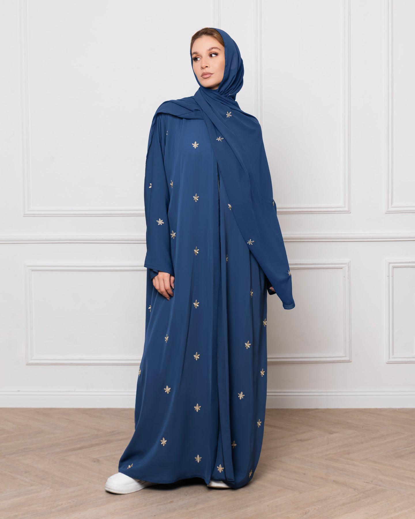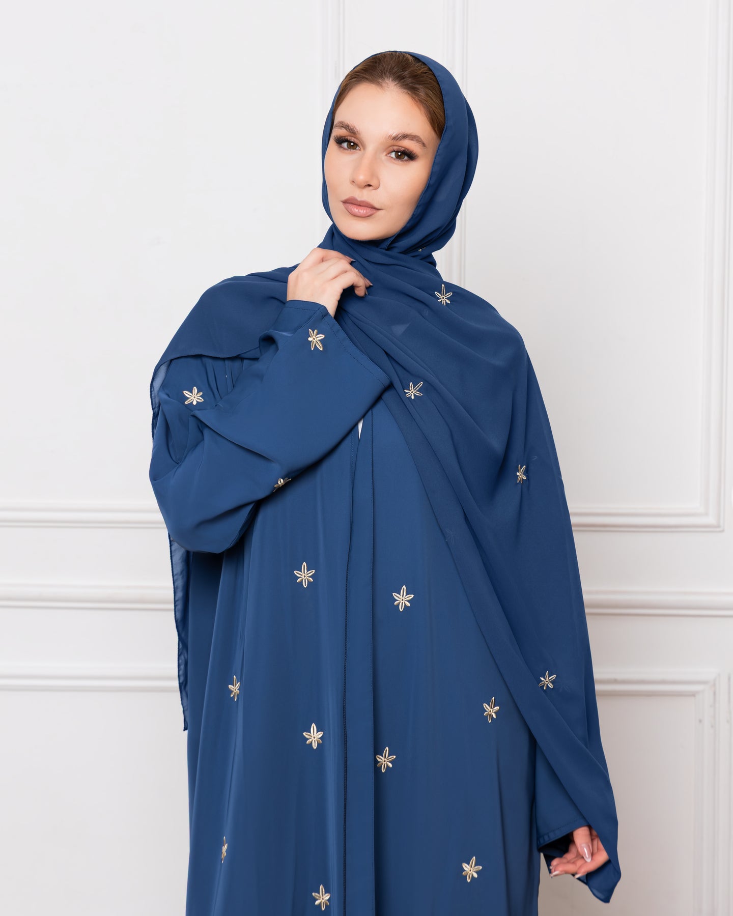 A front-open abaya in premium Nada, paired with a matching scarf and finished with delicate floral embroidery.